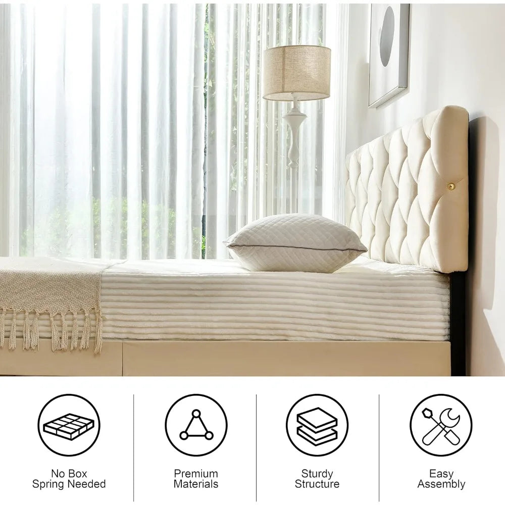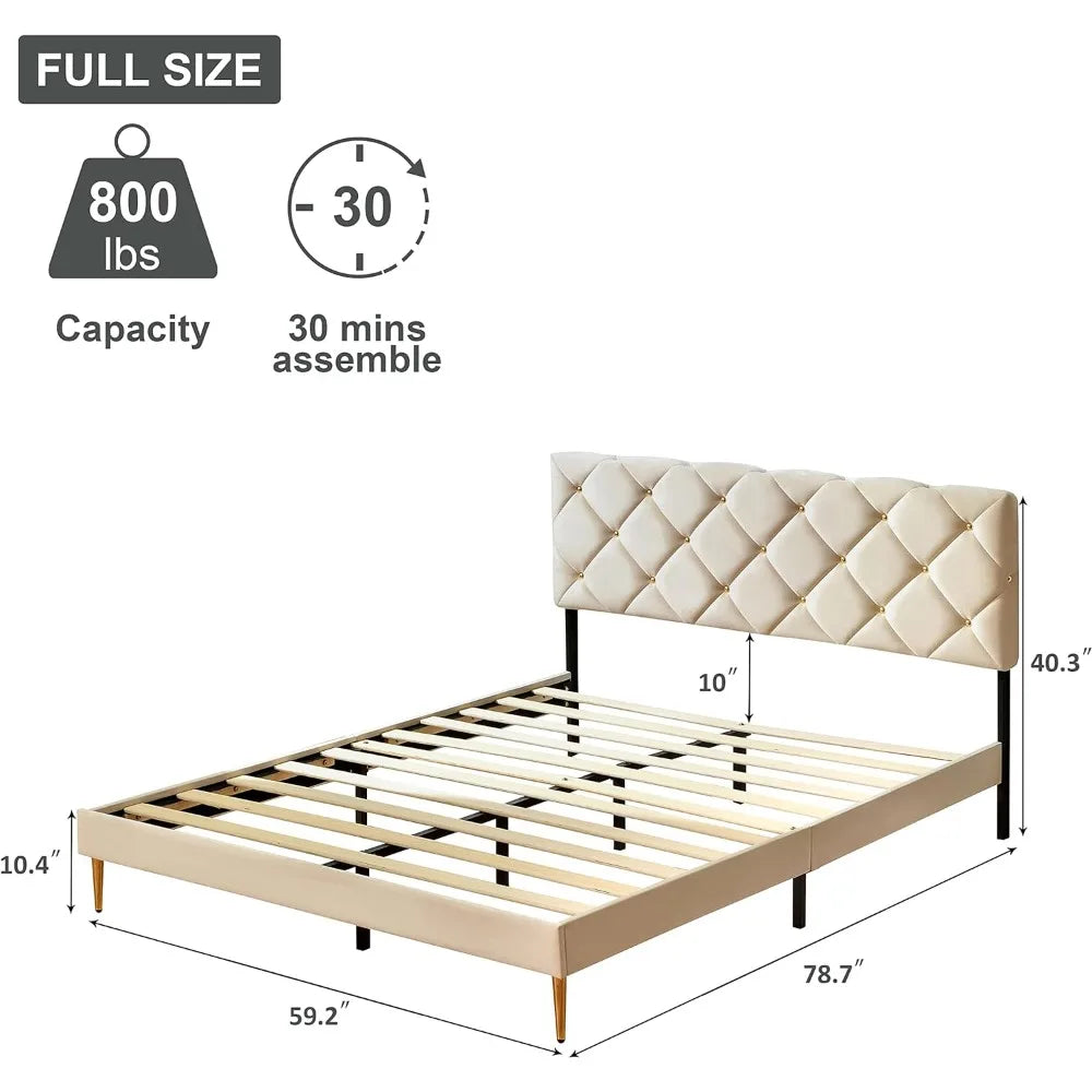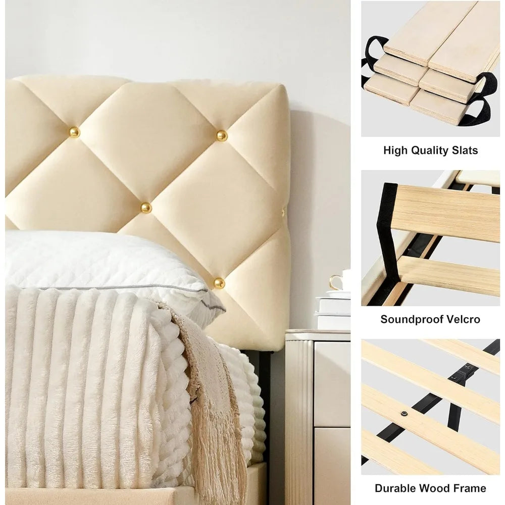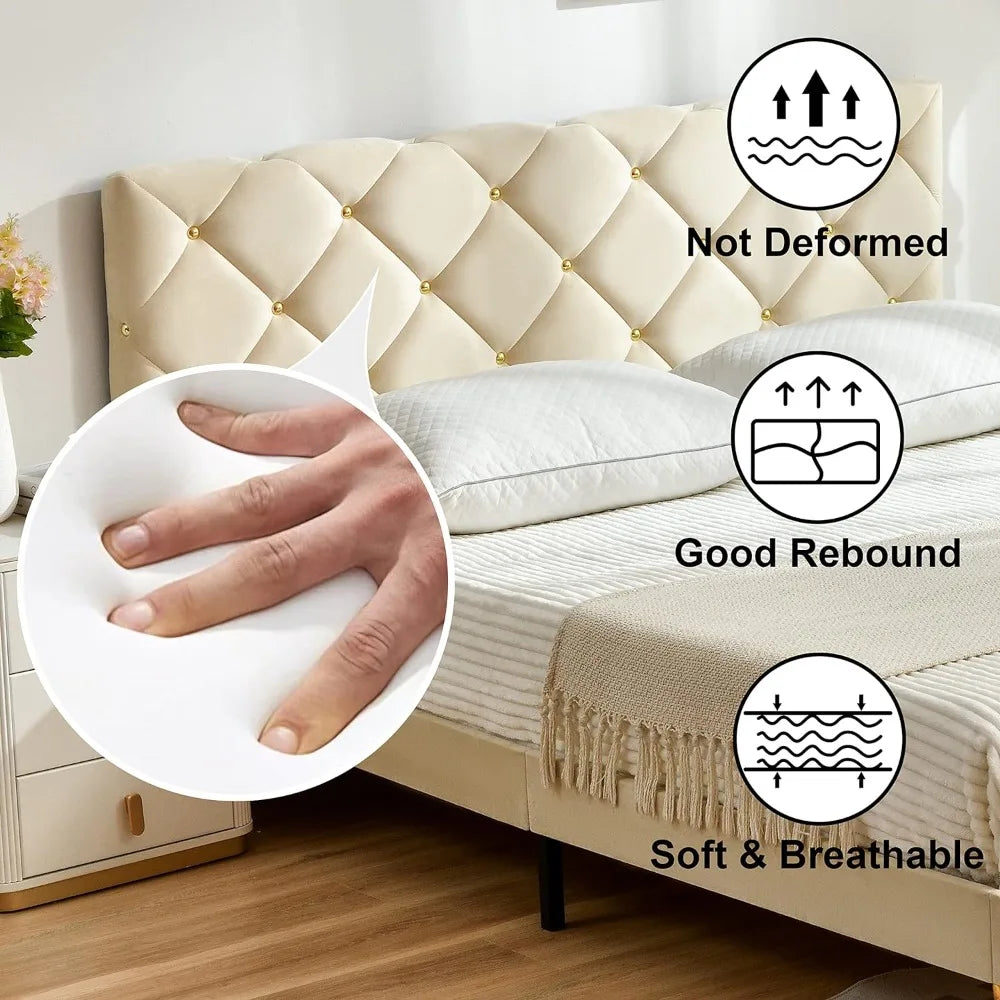 Full-size Bed Frame, Velvet Upholstered Headboard and Wood Slats